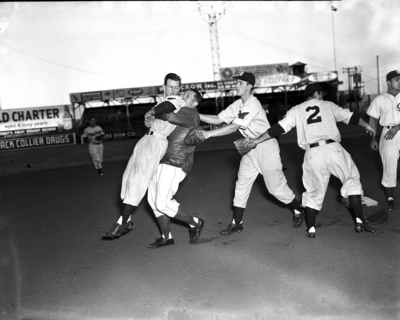 Pitcher Pete Mondorff of the Cats carries Eagle Shortstop Clyde Perry from the battle scene after Perry and Cat Bill Hunter (not shown) had exchanged punches in the first inning of game at La Grave. Joe Macko, Dallas first baseman, is back of Mondorff and Frank Tornay of Eagles stands ready to make further peace. Published in Fort Worth Star-Telegram morning edition, April 23, 1951.