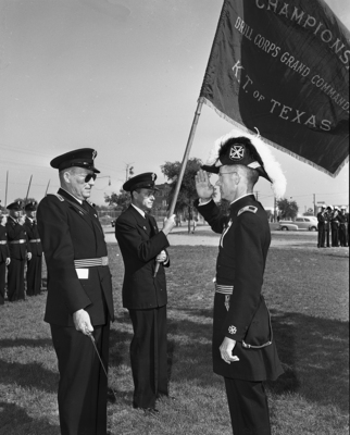 Don Gray of 612 Monticello, left, standing at sword salute as he surrendered the state championship banner Monday morning at Farrington Field for his Worth Commandery drill team to Tom J. Melton of Lufkin, chairman of the Templary instruction committee of the Grand Commandery of Texas, Knights Templar, preliminary to presenting it formally to the grand commander. Standard-bearer is Brannon Bussey Junior of 2113 Glen Crest Drive.