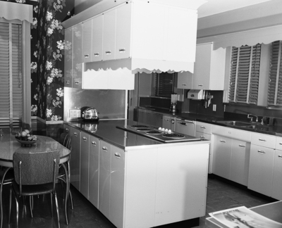 The picture shows the home of Dr. and Mrs. Tom Black, 2600 Ryan Place Drive. At the left is the breakfast area, furnished with metal chairs and table with red plastic top. The peninsula jutting out in the center of the room shows cabinet space built around the range. The color scheme is sage green, white and red. Dogwood blossoms appear in the green wallpaper. The floor is gray rubber tile. Chair-height wainscoting of Philippine mahogany was used around the open walls.