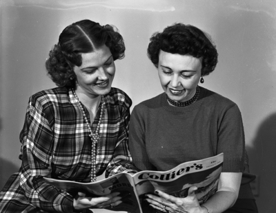Mrs. David Locker, left, district president, and Mrs. Maybell Criner, district coordinator, both of the Central Texas District of Epsilon Sigma Alpha. They are looking over a Collier's article on their national project.