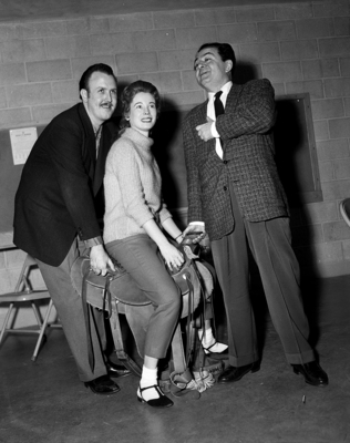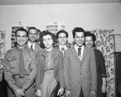 Miss Lil Marik and Miss Janan Hart helping Bob Utter with quiz