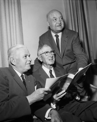 Amon Carter (right) and Brigadier General David Sarnoff, chairman of R. C. A.'s board, close the switch at WBAP-TV inaugurating first live color telecast from a Texas studio