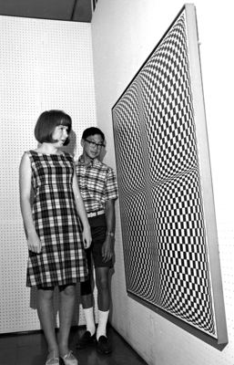 Sandra Krell, and Karl Komatsu study op art at the Fort Worth Art Center. Sandra, is taking a drawing and painting course at Fort Worth Children's Museum. Karl, has just completed a painting class at the Art Center. Fort Worth Star-Telegram Morning edition August 15, 1965.