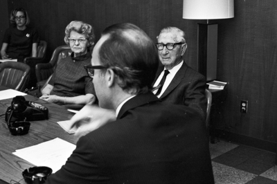 Mr. and Mrs. O. C. Armstrong listen as 1969 Community Pride Campaign chairman Ogden Kelly Shannon III, foreground, announces that the drive reached their $243,000 goal in three weeks. Fort Worth Star-Telegram Evening April 5, 1969.