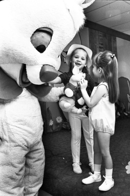 A six-foot tall "Rabbit" from the pages of A. A. Milne's "Winnie-the-Pooh" shows a smaller version of another character from the books, Piglet, to two young models wearing clothes from the summer "Pooh" collection. The romper suit is made of pink and white seersucker, lined, and buttoned over the shoulders. The other girl wears stretch pants of white nylon with a red and white striped poor boy sweater and floppy brim hat. Fort Worth Star-Telegram Evening edition March 17, 1967.