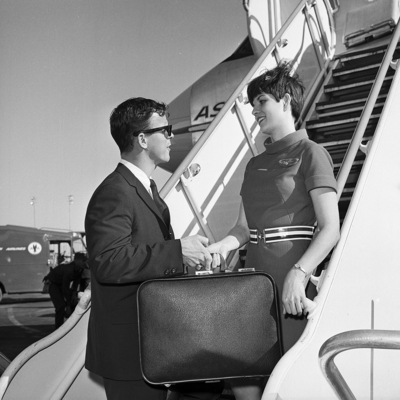 Bill Hendricks, Star-Telegram reporter, seemed happy enough as Mary Kibble, American Airlines stewardess, greeted him for a flight to San Francisco. Fort Worth Star-Telegram Morning edition December 13, 1967.