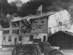 42nd Bomb Squadron gunnery hangar in flames; barrack building at lower right was not damaged, Carswell Air Force Base, Fort Worth, Texas, 03/15/1960
