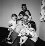 Richard F. Barrows with seven children; beginning at 8:00, clockwise, Ricky (striped shirt), Linda, Bonnie, Stephen, Nancy, Marguerite, and Michael, 06/15/1960