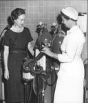 Two women standing by oxygen tanks at Cook Memorial Children's Hospital - nurse anesthetist Mrs. Laura Cooper, and Mrs. David Stephens, 07/10/1960