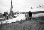 A six-passenger, twin-engine private plane lies in a gully about 50 yards from the end of Meacham Field's northwest-southeast runway where it came to an uneasy halt. The plane skidded sideways off the end of the runway and None of the three passengers aboard nor pilot Herbert Van Der Vliet was injured in this mishap. The plane was a De Havilland Dove owned by Fort Worth oil man J. Lloyd Patton. Damage to the plane included a twisted fuselage, bent left wing, and twisted landing gear.