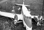 A six-passenger, twin-engine private plane lies in a gully about 50 yards from the end of Meacham Field's northwest-southeast runway where it came to an uneasy halt. The plane skidded sideways off the end of the runway and None of the three passengers aboard nor pilot Herbert Van Der Vliet was injured in this mishap. The plane was a De Havilland Dove owned by Fort Worth oil man J. Lloyd Patton. Damage to the plane included a twisted fuselage, bent left wing, and twisted landing gear.