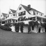 Texas newsmen climbed on the porch railing to get better photo angles when John F. Kennedy and Lyndon B. Johnson, the Democratic ticket, posed in the rain for pictures at the home of Kennedy's father, former ambassador Joe Kennedy. John F. Kennedy and Lyndon B. Johnson seen with their backs to camera in the porch corner in Cape Cod, Massachusetts.