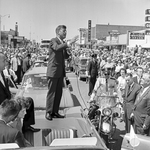 Senator John F. Kennedy speaks on top of a convertible, with Senator Lyndon B. Johnson to the left, to an estimated 1,500 people gathered along the campaign route through Grand Prairie as the two Democratic running mates move eastward towards Dallas after the rally in Fort Worth's Burnett Park. Johnson and Kennedy were on a political campaign through Texas with stops in Fort Worth, Arlington, Grand Prairie, and Dallas. Visible businesses in the background include Millar Drugs [Walgreen Agency], C. R. Anthony Company, Shelton's, Austin Shoes, May Jewelry, J. C. Penney's Woolworth's, Wings, and Montgomery Ward.