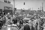 Senator Lyndon B. Johnson, left, and Senator John F. Kennedy, seated on the rear of a convertible, waving to crowds of people along the campaign route through Arlington as the two Democratic running mates move eastward towards Dallas after the rally in Fort Worth's Burnett Park. Johnson and Kennedy were on a political campaign through Texas with stops in Fort Worth, Arlington, Grand Prairie, and Dallas. Visible businesses in the background include Sherwin-Williams Paints, Arlington State Bank, Nichols Cleaners, and a Gulf gas station.