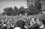 Burnett Park was crawling with Democratic officials as Senators John F. Kennedy and Lyndon B. Johnson brought their campaign to Fort Worth. Johnson and Kennedy stand on the speaker's platform with Representative Jim Wright to the right of Kennedy. Johnson and Kennedy were on a political campaign through Texas with stops in Fort Worth, Arlington, Grand Prairie, and Dallas.