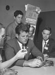 Ted Kennedy with Ricky Rapfogel, left, and Sam Houston Allred, right, at a rally held for Democratic Presidential candidate John F. Kennedy at Arlington State College (A.S.C.). An unidentified man behind Ted Kennedy is holding a sign that reads "Teens for J.F.K." and "Kennedy for President." The sign shows cut-out photos of of John F. Kennedy and Lyndon B. Johnson. Ted Kennedy appears to be inspecting a set of spurs set on the table before him.