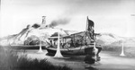 Six Flags Over Texas, Arlington; concept photo of French boat with passengers and fort on hill opening fire with cannon.