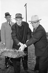 Groundbreaking for Texas Christian University (T. C. U.) coliseum; from left: [Unknown] White, basketball coach Buster Brannon and athletic director L.R. (Dutch) Meyer, 02/22/1961.