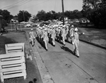 The Sam Houston Rifles have built their "hup-hup" into a big reputations for being "hep" on the Arlington State College campus. One can almost hear the bagpipes play as the Sam Houston Rifles practice their fancy drill on the ASC campus. The "Jodie's" swing out their arms to shoulder level as the British style of marching. Published in Fort Worth Star-Telegram morning edition May 14, 1961.