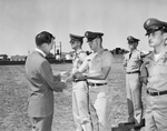 Dr. Jack R. Woolf congratulates Cadet John R. Krystinik Jr., right, for being named one of the two distinguished military students at Arlington State College. the other top honoree, Joel H. Ward, stands at attention after being decorated. Published in Fort Worth Star-Telegram May 12, 1961.