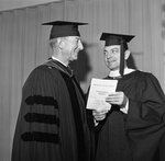 Image shows Arlington Mayor Tom J. Vandergriff, right, talking with Dr. M. T. Harrington, chancellor of the Texas A&M College system at graduation for Arlington State College. Vandergriff received a plaque for his "exceptional generosity, devoted service and outstanding leadership". Published in Fort Worth Star-Telegram morning edition May 31, 1961.