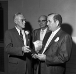 James W. Martin, right, superintendent of Arlington schools, was named Arlington's Citizen of the Year along with Dr. Jack R. Woolf, president of Arlington State College, H. A. D. Dunsworth, center, accepts an award plaque in Dr. Woolf's absence from H. E. Caton, a director of the Arlington Chamber of Commerce.
