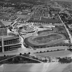 Aerial of athletic plant at Texas Christian University (T. C. U.); circular building is the new basketball coliseum; lower left is the football stadium and in the foreground is a cinder track.