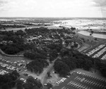 Airview of Six Flags Over Texas, 08/10/1961. The parking lot of the theme park can be seen featured in the picture.