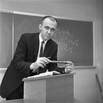 Image shows Dean of Arlington State College's School of Engineering, Dr. Wendell Nedderman. He is carefully selecting faculty, a modern theory of instruction and a well-equipped physical plant to aim to make the school one of the best in the nation. On the state level ASC's School of Engineering students make it second only to the University of Texas. Published in Fort Worth Star-Telegram morning edition August 27, 1961.