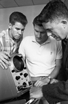 Image shows right, Dr. A. E. Salis, head of the department of electrical engineering, explaining an oscilloscope pattern to Robert Hampton, left a senior, Dallas and Roland Haden, center, Arlington Senior. The school of Engineering is spending thousands of dollars to equip its engineering building. Published in Fort Worth Star-Telegram morning edition August 27, 1961.