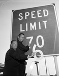Doyle Willis and Don Gladden put up a 70 m.p. h. speed limit sign on the Dallas-Fort Worth Turnpike.