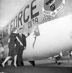 Miss Virginia Lattimore, 17, follows through on a mighty swing to christen a B-52F Stratofortress "The City of Fort Worth" as J. Frank Keeton, mayor pro tem, watches during ceremonies at Carswell Air Force Base. The plane will be flown by Carswell teams in competition for the Fairchild Trophy at Spokane, Washington.