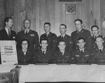 Herbert J. Foster, vice president of the Downtown Fort Worth Association, and Col. Frank E. Marek, Carswell base commander, pose with airmen who received outstanding citizenship certificates, standing from left: Foster, Marek, A/2C Francis R. Berard, A/1C Vernon R. Jones, A/2C Ralph E. Dyer, and M. Sgt. Harry H. Cooper; seated from left: A/2C Adina G. Roos, A/2C Malcolm S. Trevett, A/1C Richard E. McKlem, A/1C William H. Fields, and A/1C George E. Schipper, Carswell Air Force Base, Fort Worth, Texas, 11/01/1961
