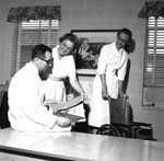Robert F. Scott, executive director of Fort Worth Society for Crippled Children and Adults, with volunteer Mrs. Rudy Dvorak, center, and Catherine Currie, therapist, 04/03/1962