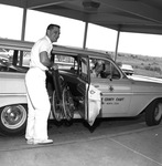 Bob Harden, director of physical therapy at Fort Worth Society for Crippled Children and Adults, loads child's wheelchair into car from Tarrant County's American Red Cross, driven by Mrs. Leslie W. Buhrmester, 04/03/1962