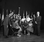 The 16 pianists selected to enter the final week of the Van Cliburn International Piano Competition gathered in front of flags of the nations which they represented. Seated, left to right, are Ilze Graubin and Nina Lelchuk of Russa, Cecile Ousset of France, Marilyn Neeley of California, and Hiroko Nakamura of Japan. Standing, from left, are Sergio Varella-Cid of London, who is representing Portugal, Arthur Charles Fennimore of Pennsylvania, Donn-Alexandre Feder of New York, Mikhail Voskresenski and Nikolai Petrov of Russia, Hajime Kono of Japan, John Perry of Kansas, Raul Sosa of Argentina, and Takashi Andrew De Groote of Belgium.