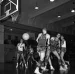 A free ball gets the attention of Texas Wesleyan College's (TWC) James Brown (12) and Arlington State's Gordon Givens (40) during the non-conference basketball game in Arlington. At far right is Irvin Rue of Arms. Published in Fort Worth Star-Telegram morning edition January 16, 1963.