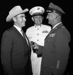 Congressman Jim Wright, left, and Col. Frank E. Marek, base commander at Carswell Air Force Base, right, welcome Medal of Honor recipient Col. L. H. Wilson, who spoke to a huge throng at Benbrook Lake for Independence Day.