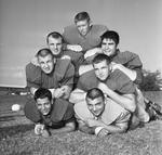 Hoping to see lots of action for Arlington State's football team this fall are, clockwise from lower left: Tackle Mike Farhat, End Mike Cook, Tailback Ken Bowman, Wingback Ken Vaughn, Guard Ray Ragland, Guard John Osborne, and Guard Kenneth La Judice. Published in Fort Worth Star-Telegram morning edition September 4, 1963.