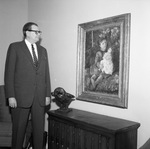Sam Cantey III, executive vice president of Fort Worth Art Association, inspects art in presidential suite of Hotel Texas: Monet painting and Picasso sculpture for President John F. Kennedy's visit to Fort Worth.
