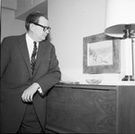Sam Cantey III, Executive Director of the Fort Worth Art Association, stands next to a Marin painting hung in Suite 850, Hotel Texas, prepared for a visit by President and Mrs. John F. Kennedy.