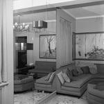 Sitting arrangement with corner couch and Chinese wall hanging in Suite 850, Hotel Texas, prepared for a visit by President and Mrs. John F. Kennedy.