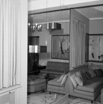 Sitting arrangement with corner couch and Chinese wall hanging in Suite 850, Hotel Texas, prepared for a visit by President and Mrs. John F. Kennedy.