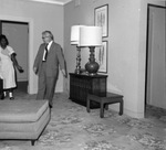 A. D. Rials, assistant manager of Hotel Texas, in Suite 850 living room with maid; suite being prepared for a visit by President and Mrs. John F. Kennedy.