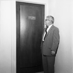A. D. Rials, assistant manager of Hotel Texas, inspects the door plate ("Suite Eight Fifty") for the suite of rooms prepared for President and Mrs. John F. Kennedy's visit.