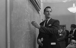 Julian Read, press secretary for Gov. John Connally, at chalkboard in Parkland Hospital explaining John F. Kennedy's wounds to the press, at time of assassination.