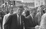 John F. Kennedy walking in group of men near Hotel Texas, Fort Worth; Rep. Jim Wright to JFK