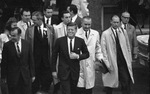 John F. Kennedy entering Hotel Texas parking lot with group of men, including Jim Wright, Don Kennard, Gov. John Connally, and Vice President Lyndon B. Johnson.