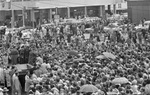 Overhead view of large crowd outside Hotel Texas to hear John F. Kennedy speak.