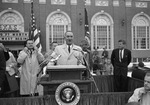Lyndon B. Johnson speaking to crowd outside Hotel Texas during John F. Kennedy's visit to Fort Worth.